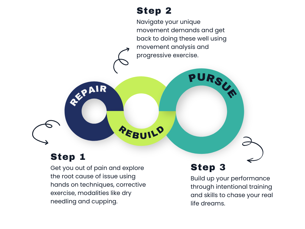 Our physical therapy care packages are designed for the early stages of treatment, providing focused, consistent care tailored to your unique needs. Based on your diagnosis, recovery goals, and prognosis, we create a personalized plan of visits to reduce pain, restore movement, and rebuild strength efficiently. These packages are an ideal way to follow our three-step process of Repair, Rebuild, and Pursue, giving you a clear roadmap for your recovery journey.
